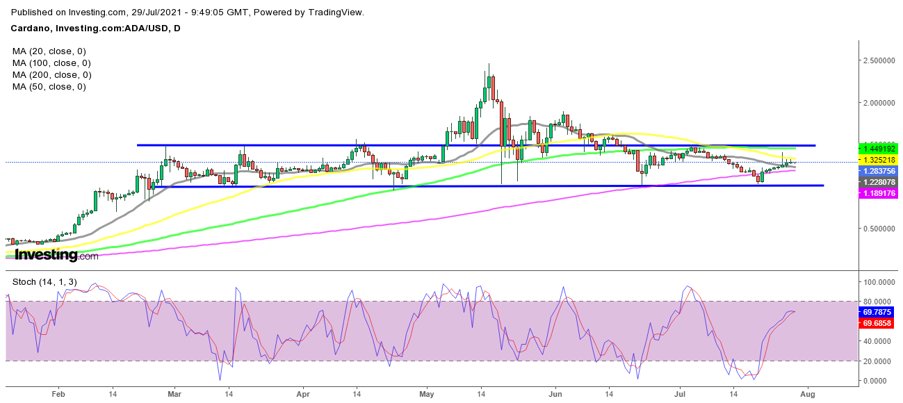 ADA/USD kehrte sich vom unteren Ende der Spanne über 1 US-Dollar um und steuert auf die Spitze der Spanne zu. Obwohl Cardano-Käufer diese Woche irgendwie schwach erscheinen und nicht in der Lage sind, den täglichen SMA von 50 (gelb) zu überschreiten, während der SMA 100 (grün) und die Spitze der Spanne bereit sind, Widerstand an der Spitze zu bieten.