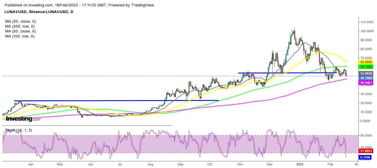 Terra LUNA ging von einem Hoch von 106 $ auf 43 $ zurück, was bedeutet, dass er rund 60 % seines Wertes verlor. Aber seit das starke rückläufige Momentum im Januar endete, sieht AVAX stärker aus als die LUNA coin. Es feierte in den vergangenen Wochen ein starkes Comeback, stieg von 53 $ auf 96 $ und verdoppelte seinen Wert fast, während LUNA es kaum auf 60 $ schaffte und nun wieder auf die Tiefststände zusteuert.