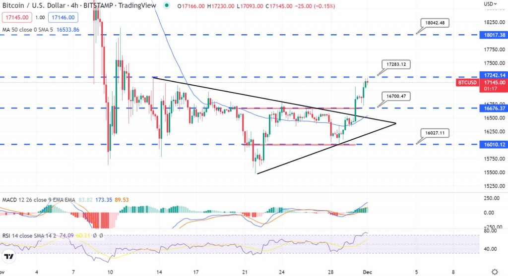 Der Preis von Bitcoin konnte die 17.000-Dollar-Marke durchbrechen. Bitcoin konsolidiert Gewinne und könnte weiterhin über 16.750 $ unterstützt werden. Der Preis von Bitcoin hat sich deutlich über dem Unterstützungsniveau von 16.500 $ gehalten. BTC gewann an Schwung und durchbrach die Widerstandszone von 16.800 $ sowie den 100-Stunden-SMA.Der Preis stieg so weit, dass er die Widerstandsmarke von 17.000 $ überschritt. Bevor die Bullen von den Verkäufern getroffen wurden, ging es bis auf 17.250 $. Es konsolidiert derzeit Gewinne über der 17.000-Dollar-Marke. Der Preis wird nahe dem 23,6% Fib-Retracement-Level des Aufwärtstrends vom Swing-Tief von 16.690 $ bis zum Hoch von 17.250 $ gehandelt.