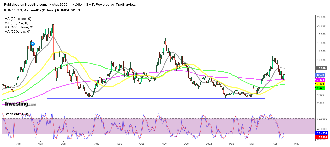 Obwohl der Anstieg auf die Einführung neuer Plattformfunktionen zurückgeführt wurde und was kommt, hat das bullische Momentum in RUNE im März unterstützt und es scheint ihm wieder zu helfen, da der Preis von dem gleitenden Durchschnitt abprallt, der bei 7,50 liegt. Als DEX beseitigt THORChain jetzt die Notwendigkeit von Vermittlern für den Handel mit nicht-nativen Kryptos. Händler können über Thorchain Token über verschiedene Netzwerke hinweg tauschen. Sie werden auch Thorfinance (Thorfi) einführen, das das Ausleihen und Verleihen unterstützen wird, sodass Händler von dieser Kryptowährung begeistert sind. Heute sehen wir jedoch kein Follow-Through, also mal sehen.