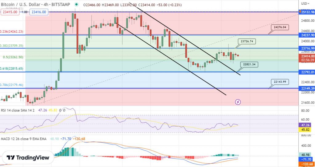 Wenn es Bitcoin jedoch nicht gelingt, die Widerstandsmarke von 23.650 $ zu durchbrechen, könnte der Preis weiter fallen, wobei die kurzfristige Unterstützung bei 23.200 $ und die nächste bedeutende Unterstützungsmarke bei 22.800 $ liegt. Wenn sich der Abwärtstrend fortsetzt, könnte der Preis auf 22.200 $ fallen, wobei die nächste wichtige Unterstützungsebene bei 22.000 $ liegt.