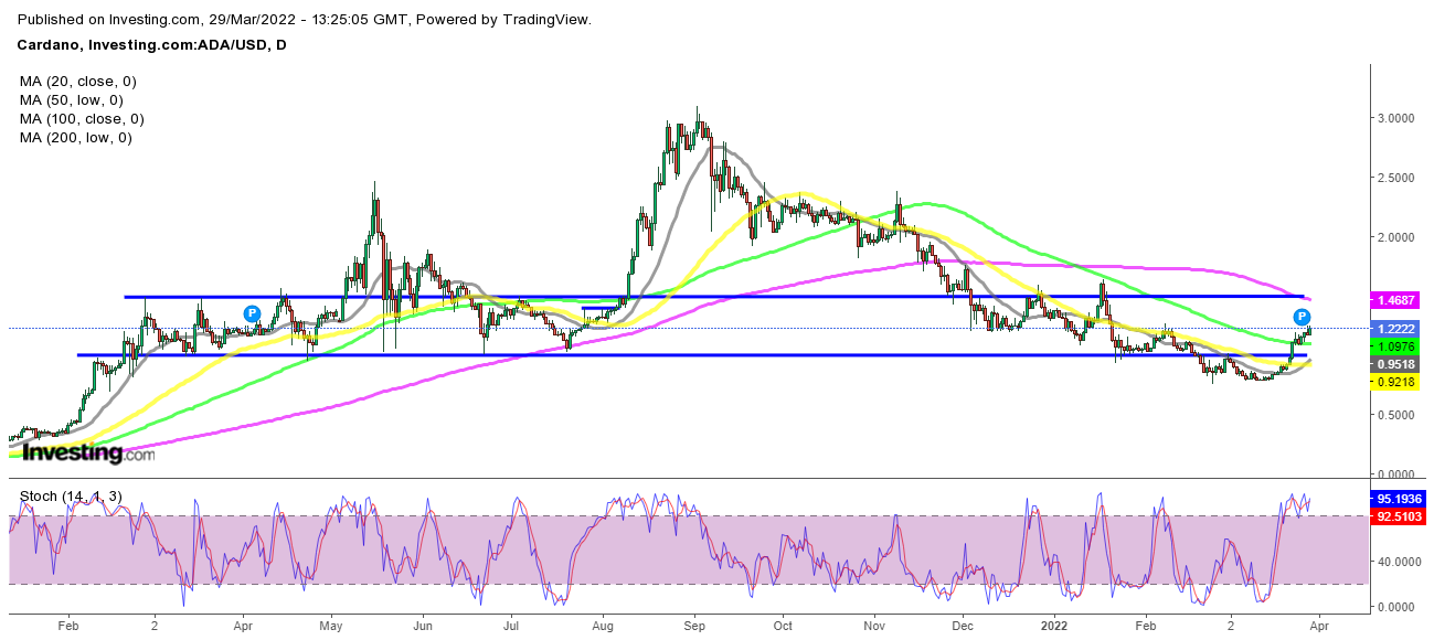 Dies hat dazu beigetragen, die Nachfrage nach ADA-Token zu steigern, und der für Juni 2022 geplante Vasil Hard Fork trägt ebenfalls zur Verbesserung der Stimmung bei. ADA/USD fiel von 3,10 $ im September letzten Jahres auf 0,75 $, wobei der 50-Tages-SMA (gelb) und der 100-SMA (grün) als Widerstand fungierten. Aber nach der Umkehrung in den letzten zwei Wochen ist Cardano über 1 $ gestiegen und hat diese beiden gleitenden Durchschnitte durchbrochen, obwohl es immer noch über 1,50 $ steigen muss, um als bullisch zu gelten, da es hier immer noch in der neutralen Zone gehandelt wird.