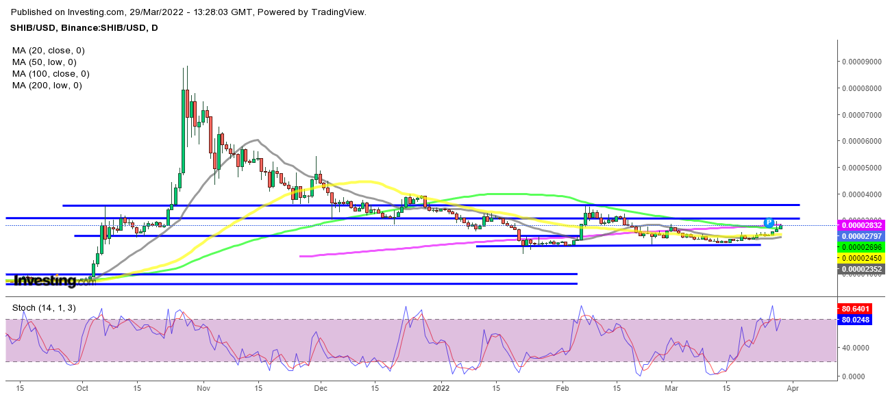 Die Unterstützung bei etwa 0,000020 $ hielt für Shiba Inu und stieg gestern auf fast 0,000030 $, was einen 50%igen Gewinn in zwei Wochen bedeutet. Aber der 200 SMA (lila) fungierte gestern als Widerstand, und heute unternimmt Shiba einen weiteren Versuch mit diesem gleitenden Durchschnitt. Wenn Käufer dieses Niveau überschreiten, liegt der nächste Widerstand bei 0,000035 $ und darüber wird SHIB/USD wieder als bullisch angesehen. gestern stellte Etherscan fest, dass ein Krypto-Wal letzte Woche 200.588.182.473 Shiba-Inu-Münzen gekauft hat, was der bullischen Sache geholfen haben muss. Außerdem wird die Shiba-Inu-Gemeinschaft „ShibArmy“ mit einer großen Ankündigung, die für den 30. März geplant ist, gehänselt.