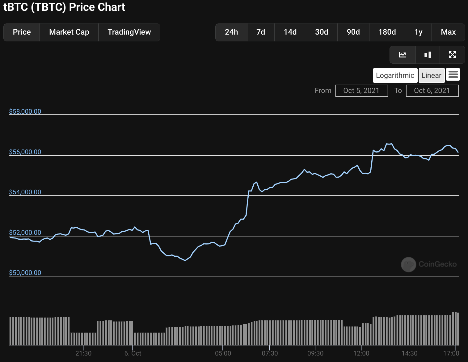 TBTC ist in den letzten 24 Stunden um 8,2% gestiegen, ebenso wie Bitcoin – auf 56.327,68 $.