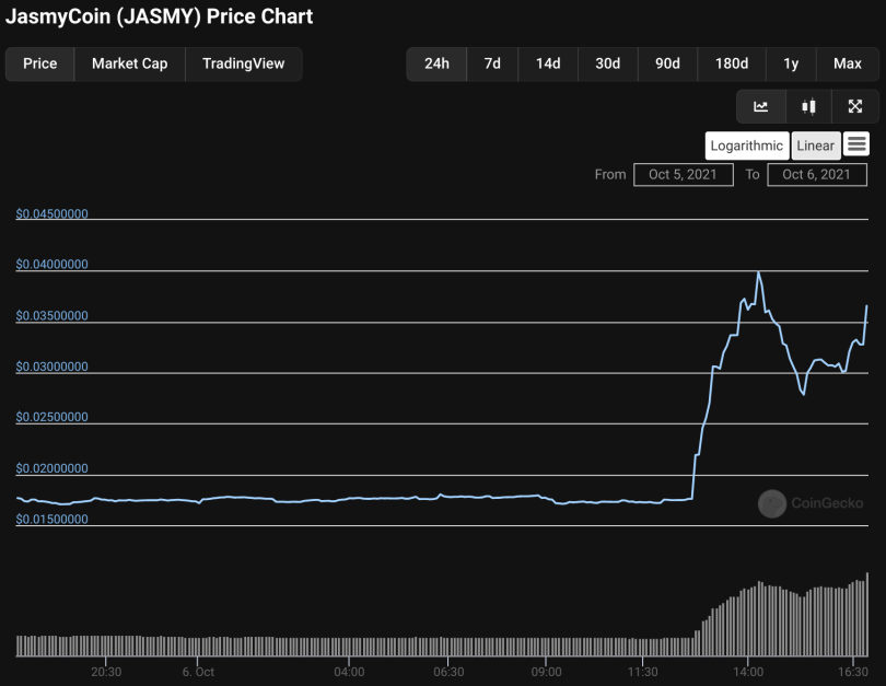 JASMY ist von einem 24-Stunden-Tief von 0,017 USD auf ein Hoch von 0,039 USD gestiegen – ein Anstieg um 129%.