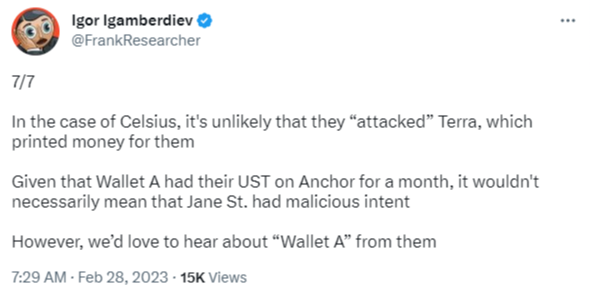Um sicher zu sein, sagte Jumps Bericht, dass die Liquiditätsprobleme durch Transaktionen von einer anderen Wallet, die als Wallet B gilt, verschärft wurden. Aber diese Wallet gehörte dem Krypto-Kreditgeber Celsius, wie Igamberdiev am Dienstag in seinem Thread schrieb: