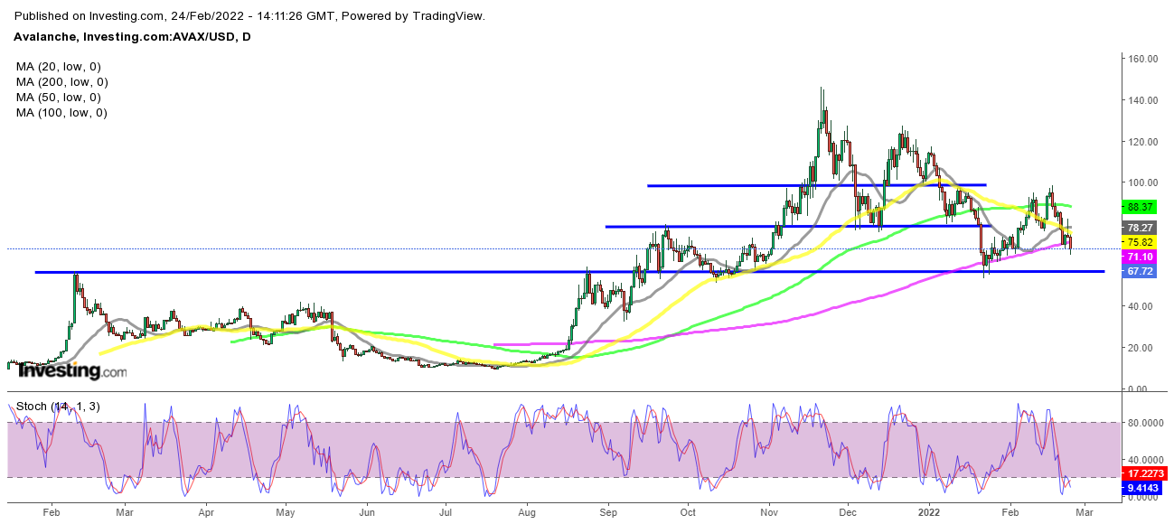 Der Kryptowährungsmarkt verhält sich zunehmend wie ein normaler Risikomarkt, ähnlich wie der Aktienmarkt, der sich erholt, wenn die Stimmung positiv ist, und sinkt, wenn die Stimmung negativ wird. Die Risikostimmung wurde in den letzten zwei Tagen sauer, weil Russland in der Ukraine vorrückte, sodass der Kryptomarkt nachgab und Bitcoin auf 34.400 $ fiel. Terra Luna und Avalanche Crypto hat sich ebenfalls nach unten umgekehrt, aber sie sehen sich Unterstützungsindikatoren gegenüber, also lassen Sie uns sehen, ob sie einen Ausbruch oder eine Umkehrung nach oben schaffen werden.