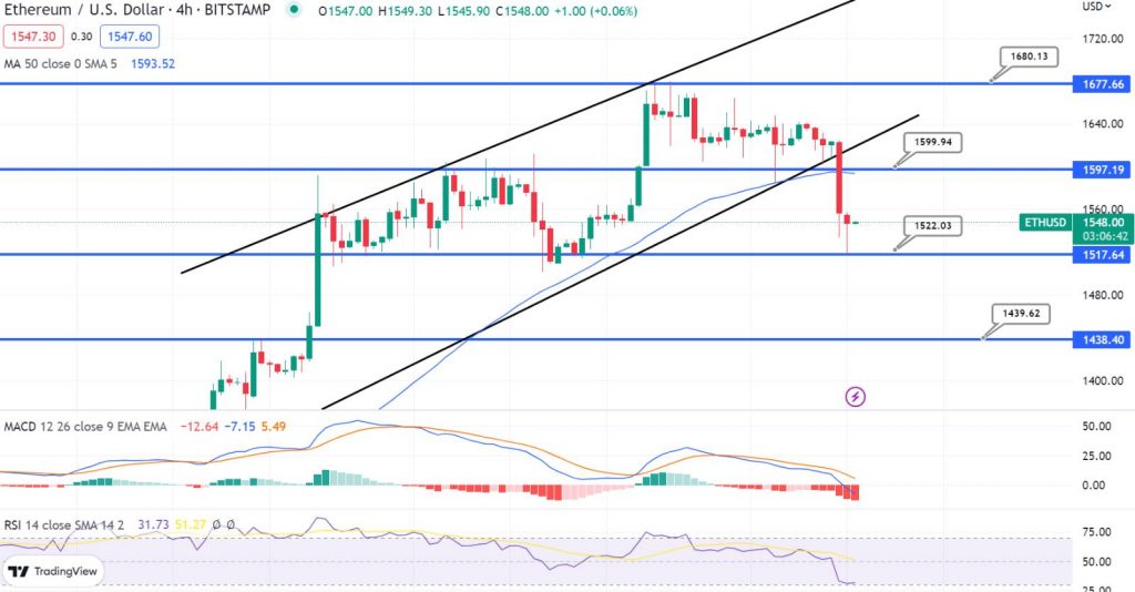 Wenn ÄTHER die 1.600-Dollar-Marke nicht durchbrechen kann, könnte es weiter fallen. Auf der anderen Seite liegt die anfängliche Unterstützung nahe dem Niveau von 1.520 $ oder dem aktuellen Tief.