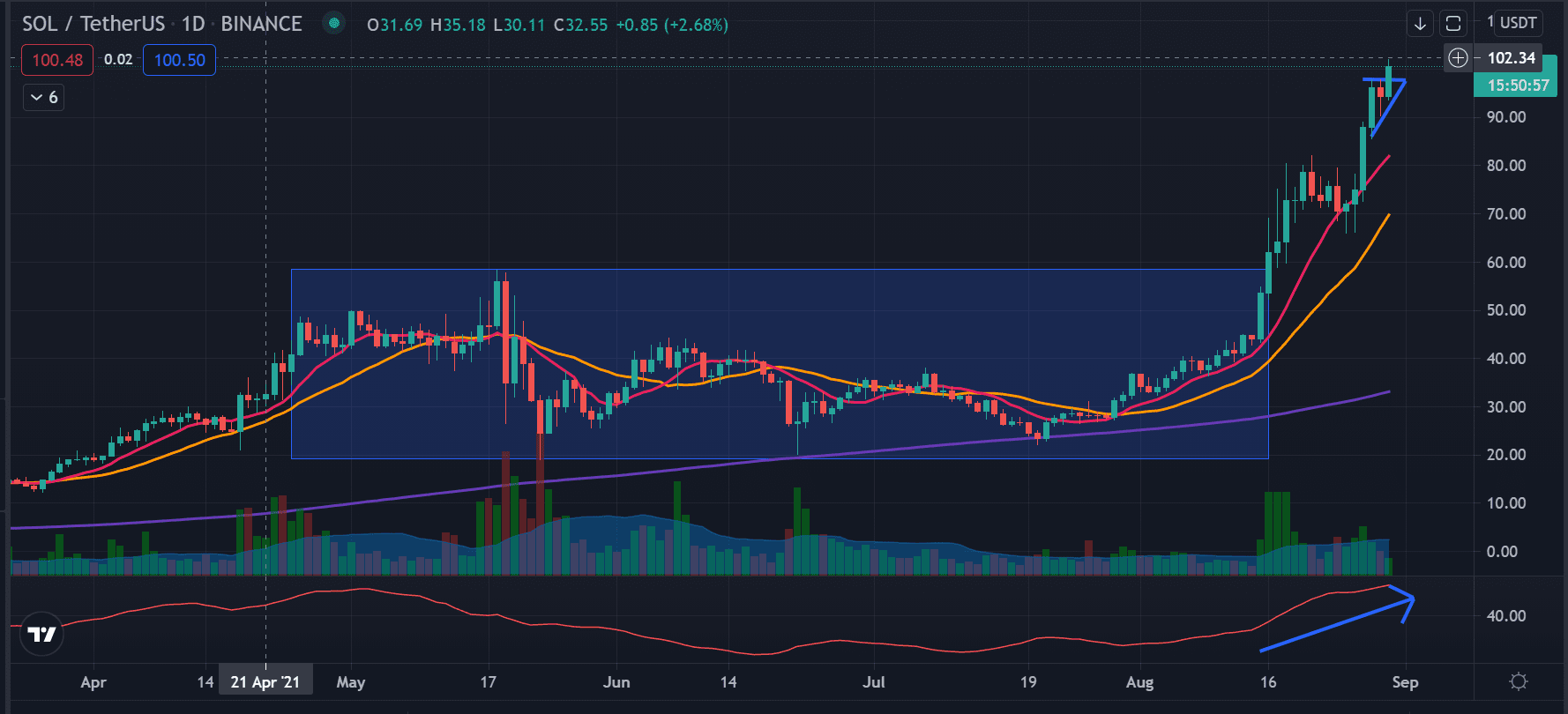 Verwalten Sie Ihr Risiko immer richtig. Berechnen Sie die richtige Positionsgröße basierend auf der Größe Ihres Portfolios. Da Sie bereits zu spät in den großen Schritt einsteigen, sollten Sie proportional schneller Gewinne mitnehmen oder Verluste reduzieren. Diese Handelsidee wird negiert, wenn SOL nicht über 100 hält oder plötzlich ausverkauft ist und große institutionelle Verkäufe aufweist. Dies wird normalerweise von einem ungewöhnlich großen Handelsvolumen zusammen mit einer roten Kerze oder anderen rückläufigen Mustern begleitet.