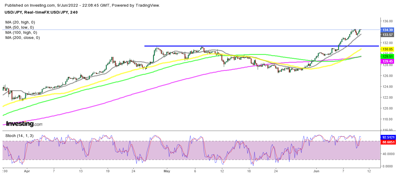 Dieses Forex-Paar ist seit zwei Jahren zinsbullisch, obwohl das zinsbullische Momentum an Fahrt gewonnen hat und die Tiefs höher wurden, während es auf die Hochs von 2002 zusteuerte. kleinere gleitende Durchschnitte haben auf dem H4-Chart als Unterstützung fungiert, was die Stärke des Aufwärtstrends zeigt. Gestern ist der Preis auf den 20 SMA (grau) zurückgegangen und wir haben uns entschieden, zwei Kaufsignale zu eröffnen, als der Preis höher gestiegen ist.