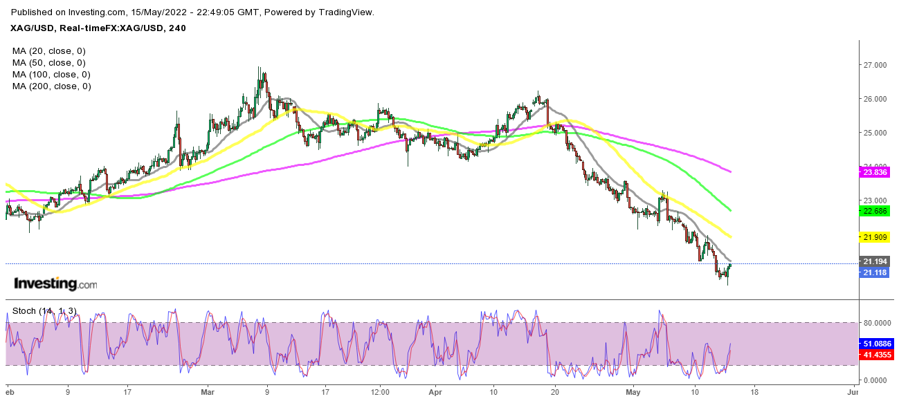 Silber und Gold fallen weiter nach unten, obwohl die Risikostimmung an den Finanzmärkten negativ war, was Risikoanlagen wie Aktienmärkte und Kryptowährungen nach unten schickte. Silber hätte als sicherer Hafen zinsbullisch sein sollen, bleibt aber bärisch, und letzte Woche entschieden wir uns, XAG/USD zu verkaufen, nachdem der Rücklauf nach oben bei 20 SMA (grau) verblasste, der mit Gewinn schloss. Wir planen, weitere Verkaufssignale bei gleitenden Durchschnitten zu eröffnen, wenn der Preis wieder nach oben zurückkehrt.