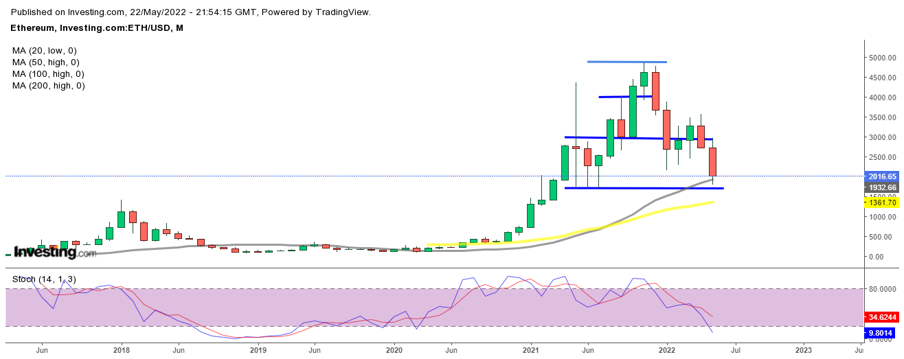 ETH/USD scheiterte im November zum zweiten Mal unter der 5.000-Dollar-Marke, und das fiel mit der Umkehrung der Krypto-Marktstimmung zusammen. Ethereum ist seitdem bärisch, abgesehen von einem gescheiterten Versuch, im März bullisch zu werden. In den letzten zwei Monaten nahm das rückläufige Momentum wieder zu und diese Kryptowährung durchbrach den 20 SMA (grau) auf dem Monats-Chart.