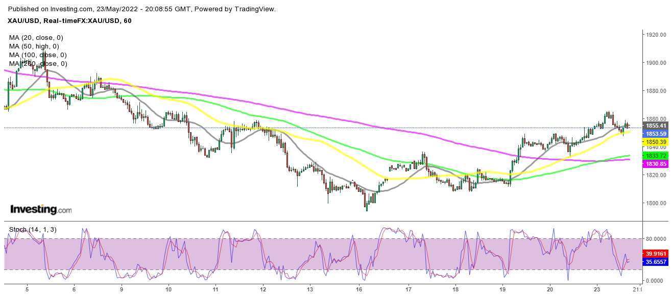 Gold war früher in diesem Monat rückläufig, da der USD weiterhin große Gewinne erzielte, aber letzte Woche kehrte es höher um, als der USD bullisch wurde. Gold handelt also hauptsächlich mit dem USD und nicht mit der Risikostimmung als sicherer Hafen. gestern eröffneten wir ein Kaufsignal, als der Preis auf dem H1-Chart auf den 50 SMA (gelb) zurückging, und verbuchten einen Gewinn, nachdem er wieder von diesem gleitenden Durchschnitt abprallte.