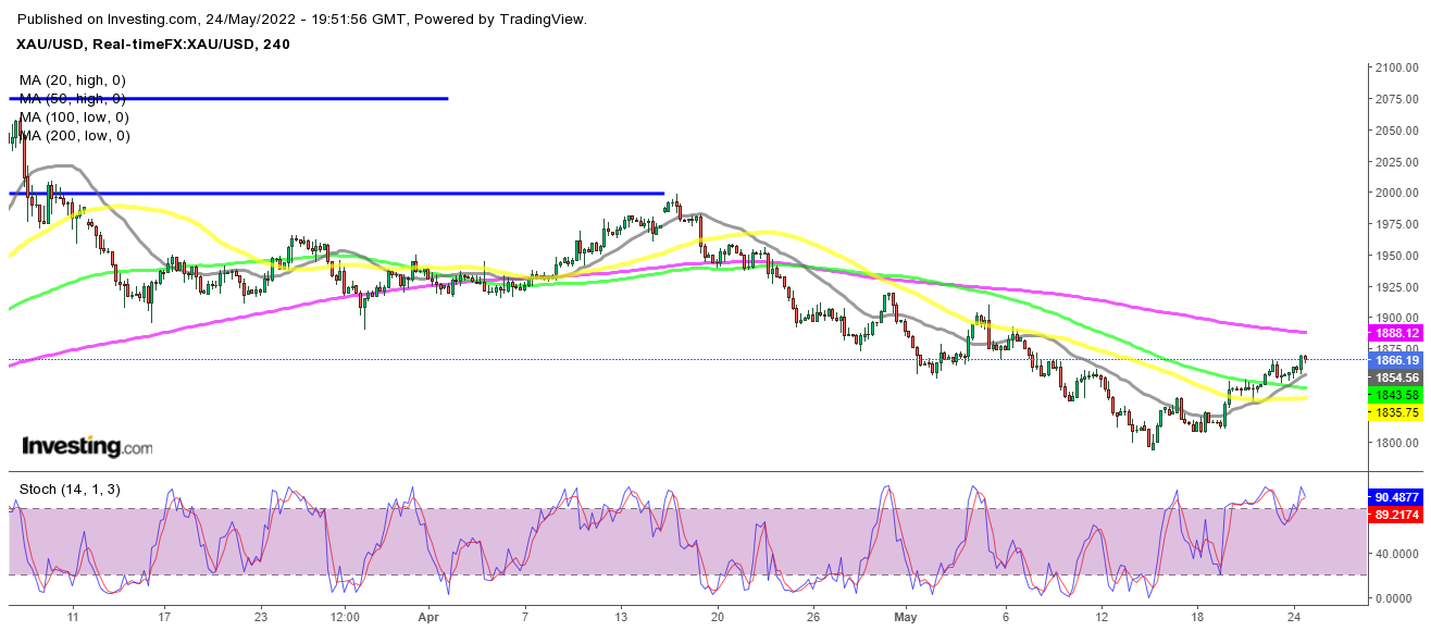 Gold war seit Anfang März rückläufig. als es über 2.000 $ stieg, aber keine neuen Höchststände erreichte und niedriger wurde. Allerdings stoppte der USD-Aufwärtstrend Mitte dieses Monats und Gold begann nach oben umzukehren. Wir hatten mehrere Kaufsignale für Gold, das letzte eröffneten wir bei 20 SMA (grau) auf dem H4-Chart, das mit Gewinn schloss, als das bullische Momentum wieder einsetzte.
