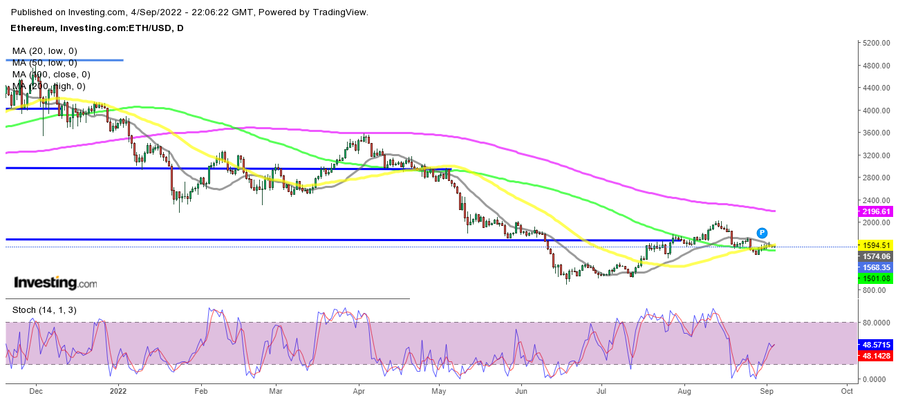 Ethereum während der Haussephase bis Mitte August fast verdoppelt und fand Unterstützung bei 20 SMA (grau) auf dem Tages-Chart, als es sich nach oben bewegte. Aber das rückläufige Momentum auf dem Kryptomarkt hat ETH/USD wieder nach unten geschickt, obwohl der 100 SMA (grün) Unterstützung bietet Ethereumes sieht also so aus, als wären dort unten noch Käufer aktiv.