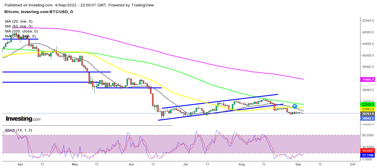 Bitcoin wurde etwa zwei Monate lang auf einem bullischen Kanal gehandelt, brach aber Mitte August unter den aufsteigenden Kanal und ist seitdem ziemlich weich geblieben. Gleitende Durchschnitte bieten weiterhin Widerstand an der Spitze, insbesondere der 50 SMA (gelb), und der Preis kehrt immer wieder unter 20.000 $ zurück, sodass die Situation nicht wirklich gut aussieht.