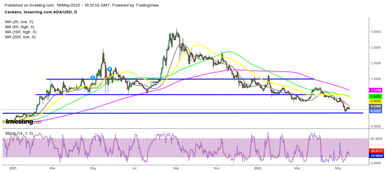 Cardano ist seit September letzten Jahres rückläufig, und dann beschleunigte sich der Rückgang im November, als die Stimmung auf dem Kryptomarkt negativ wurde. Die gleitenden Durchschnitte haben sich in Widerstand verwandelt, obwohl der vorherige Widerstand bei 0,40 $ letzte Woche als Unterstützung galt. Jetzt kehrt der Preis wieder nach unten zurück, also lassen Sie uns sehen, ob diese Unterstützung halten wird. Wenn ja, könnten wir von dort aus Long auf Cardano gehen.