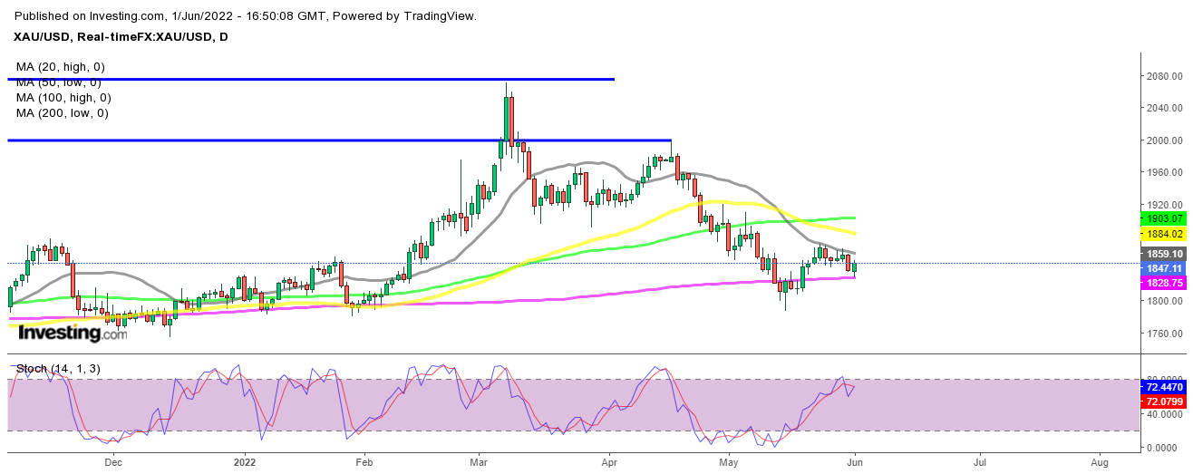 Ethereum rutschte Anfang letzten Monats auf ein Tief von 1.700 $, zog sich aber ziemlich schnell wieder zurück, was den Kaufdruck dort unten zeigte. ETH konsolidierte sich den größten Teil des Monats in einer Spanne. In den letzten Tagen haben wir eine anständige Aufwärtsbewegung gesehen, die jedoch bei 20 SMA (grau) gestoppt wurde. Gestern sahen wir eine rückläufige Umkehrung der Kryptowährungen, als die Risikostimmung negativ wurde.