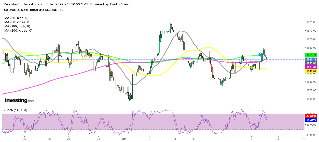Gold wurde von Anfang Mai bis Mitte letzten Monats rückläufig, als der USD weiter nach oben stieg. Aber seitdem ist der Preis in einer Spanne auf und ab gestiegen. Gestern eröffnete mein Kollege Arslan hier beim 100 SMA (grün) ein Forex-Verkaufssignal, nachdem es zuvor Widerstand geleistet hatte, aber die Käufer stiegen über diesen gleitenden Durchschnitt und erreichten das Pour-SL-Ziel, bevor Gold wieder nach unten umkehrte.