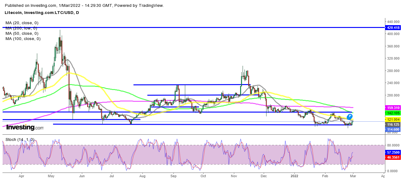 Nachdem die Kryptowährungen seit November rückläufig waren, unternahmen sie Ende Januar einen Versuch, sich nach oben zu wenden, was fehlschlug und die Kryptopreise in diesem Monat wieder fielen. Die Eskalation des Ukraine-Konflikts drehte die Stimmung an den Finanzmärkten ins Negative, was Risikoanlagen wie die Aktienmärkte belastete. Kryptowährungen tauchten erneut ab, aber dieses Mal scheint der Rückgang auf oder über dem Januar-Tief gestoppt zu sein, was darauf hindeutet, dass die rückläufige Phase vorbei sein könnte und Litecoin bald einen Aufwärtstrend erleben könnte Ethereum.