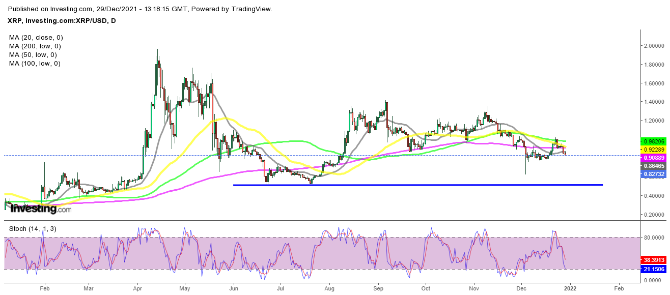 Der jüngste Versuch, zinsbullisch zu werden, endete beim 100 SMA (grün) auf dem Tages-Chart knapp über 1 USD und jetzt handelt XRP wieder bei 0,80 USD. Das Tief im November lag bei 0,60 USD, also könnten wir sehen, dass sich diese Abwärtsbewegung dort unten ausdehnt, was ein guter Ort zum Kaufen wäre Ripple coin. Wenn der Rückgang anhält, wären 0,50 USD das ultimative Unterstützungsniveau, das Sie kaufen sollten. Hoffentlich, Ripple wird den Fall mit der SEC im Jahr 2022 gewinnen, was den Preis in die Höhe treiben würde, also ist dieser Rückgang nicht so schlimm.