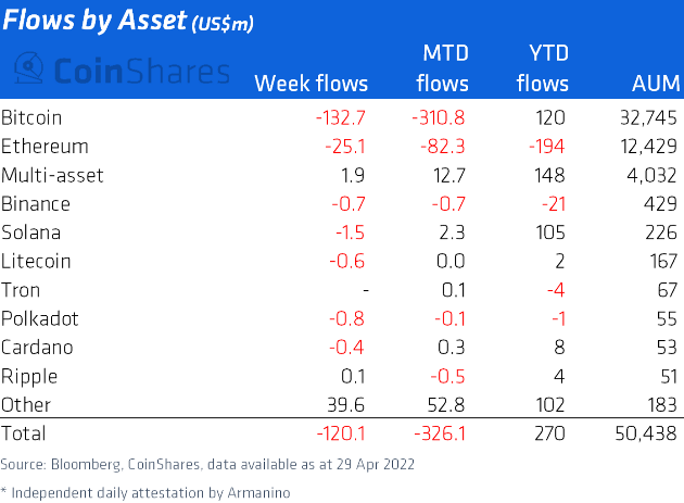 Laut dem neuesten CoinShares Digital Asset Fund Flows Weekly Report verzeichneten Krypto-Anlageprodukte in der vergangenen Woche Abflüsse in Höhe von insgesamt 120 Millionen US-Dollar.