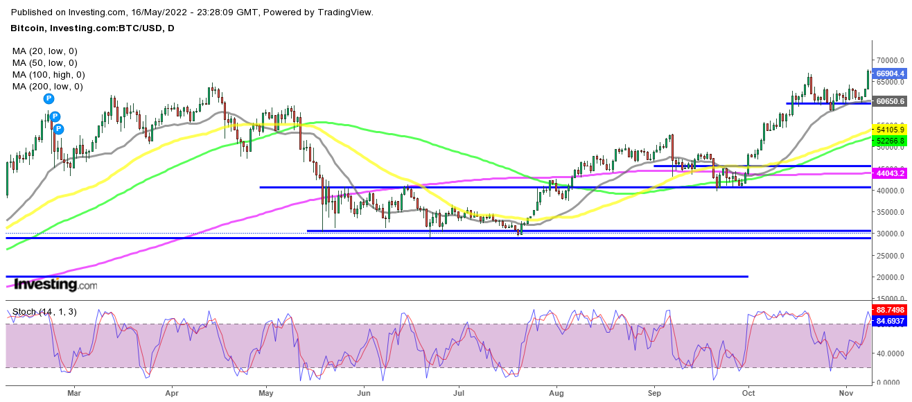 Wie wir oben erwähnt haben, neigen Kryptowährungen dazu, für bestimmte Zeiträume sehr trendy zu sein, sei es bullisch oder bärisch, da sich die Stimmung ändert, was zu massiven Bewegungen führt, insbesondere bei kleineren Kryptomünzen. Daher ist es die lohnendste Krypto-Handelsstrategie. Unten haben wir einen sehr trendigen Markt zu Beginn des Jahres 2021 und unsere Bitcoin-Handelsanalyse mit bullischem Trend hat uns viele Kaufgelegenheiten gezeigt.