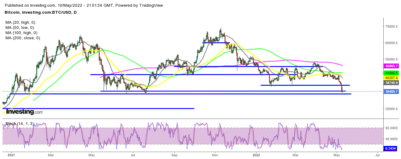 BTC/USD erreichte im vergangenen November mit 69.000 $ ein neues Rekordhoch, aber seitdem haben die Verkäufer die Kontrolle. Der letzte Versuch, bullisch zu werden, endete beim 200-Tages-SMA (lila) und der Preis kehrte wieder unter 40.000 $ zurück. Jetzt tendiert der Preis um 30.000 $, wo die Hauptunterstützungszone vor der nächsten bei 20.000 $ liegt.
