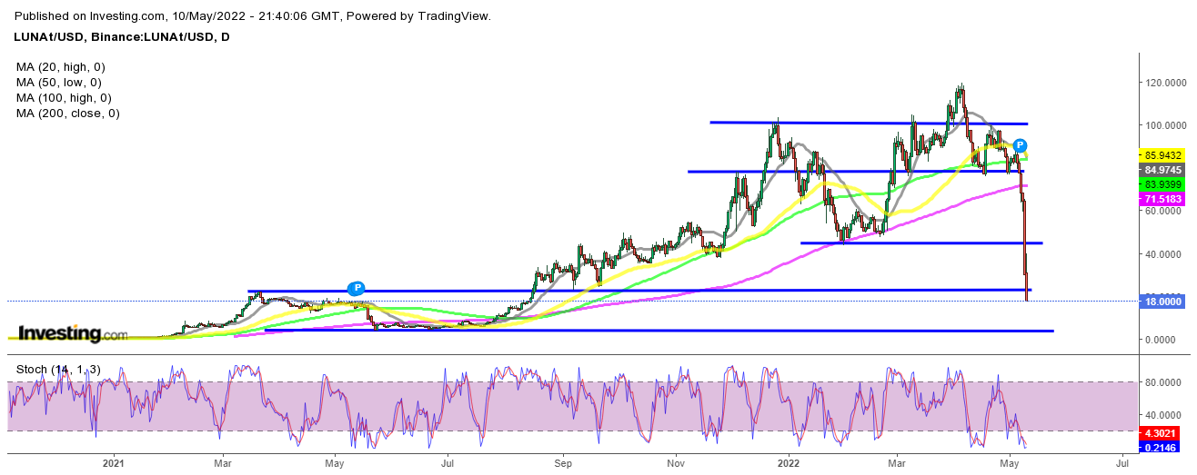 Wir entschieden uns, ein Kaufsignal bei 100 SMA (grün) zu eröffnen, das zunächst als Unterstützung diente, aber schließlich durchbrochen wurde, als Terra LUNA tiefer abstürzte und unter die 200 SMA einbrach. Die Stützzonen wurden so der LUNA aufgebrochen coin wird unter 20 $ gehandelt. $2 ist die nächste Unterstützung, die ein großartiger Ort zum Kaufen wäre.
