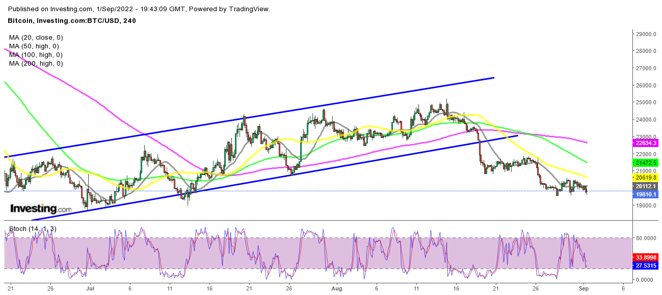 Bitcoin brach Mitte Juli unter den aufsteigenden Kanal, in dem es etwa zwei Monate lang gehandelt wurde, und bleibt seitdem ziemlich weich. Gleitende Durchschnitte bieten weiterhin Widerstand an der Spitze, insbesondere der 50 SMA (gelb), und der Preis kehrt immer wieder unter 20.000 $ zurück, sodass die Situation nicht wirklich gut aussieht.