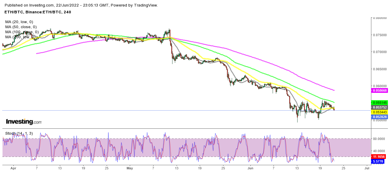 ETH/BTC befand sich mehrere Jahre lang in einem Aufwärtstrend, wurde aber im Dezember letzten Jahres rückläufig und befand sich in einem Abwärtstrend, wobei gleitende Durchschnitte als Widerstand auf dem H4-Chart fungierten. Der jüngste Rückzug endete höher unter 100 SMA (grün) und wir entschieden uns, ein Verkaufssignal zu eröffnen, da die Verkäufer immer noch die Kontrolle haben.