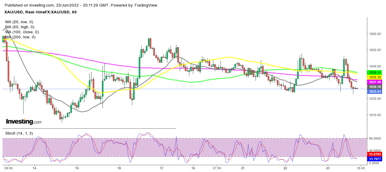 Gold setzt den Abwärtstrend seit März fort, aber in den letzten Wochen haben wir gesehen, dass Gold seitwärts gehandelt hat. Der Preis ist auf und ab gegangen und wir haben kürzlich einige gute Gewinne beim Handel mit XAU/USD erzielt. Gestern haben wir uns entschieden, hier während der Umkehrung nach unten ein Verkaufssignal zu eröffnen und Gewinne bei den Tagestiefs um 1.823 $ zu verbuchen.