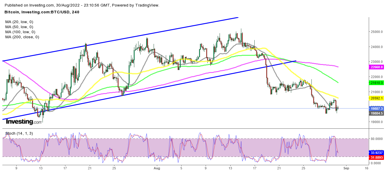 Kryptowährungen zeigen nach zwei rückläufigen Bewegungen an den letzten beiden Wochenenden weiterhin Schwäche. Am Montag sahen wir eine zinsbullische Bewegung, aber die sah ziemlich schwach aus und der Rückgang setzte sich gestern wieder fort und schickte Bitcoin wieder unter 20.000 $. Sie finden es also schwierig, wieder bullisch zu werden und anständige Gewinne zu erzielen, wie sie es früher getan haben, aber sie halten immer noch durch und werden schließlich bullisch werden.