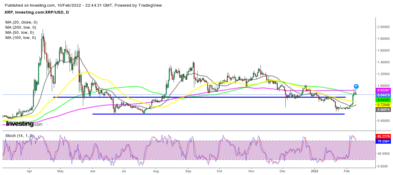 Ripple coin ist seit April letzten Jahres eine der bärischsten Kryptowährungen. Im Mai gelang es ihm nicht, neue Höchststände zu erreichen, und die Höchststände wurden im dritten Quartal des letzten Jahres niedriger, als der Kryptomarkt in die Höhe schnellte und die meisten digitalen Münzen neue Allzeithochs druckten. Die Höchststände fielen von unter 2 $ im April letzten Jahres auf 1,70 $ im Mai, auf 1,40 $ im September und 1,35 $ im November, und jetzt sieht es so aus, als würde das letzte Hoch im Bereich um 0,90 $ liegen.