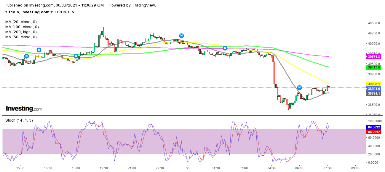 Also haben wir uns entschieden, eine Long-Position in Bitcoin einzugehen, die auf die Widerstandszone abzielt, die rund 2.000 US-Dollar höher liegt als der Boden des Pullbacks. Wir wechselten zum 5-Minuten-Chart, um einen guten Einstiegspunkt zu wählen. Der 20 SMA (grau) lehnte den Preis auf dem 5-Minuten-Chart beim ersten Versuch einer Aufwärtsbewegung ab, gab aber beim zweiten Versuch nach, und wir entschieden uns zu kaufen, als der BTC/USD über den 20 SMA stieg, was sich in verwandelte Unterstützung auf dem 5-Minuten-Chart. Jetzt warten wir also darauf, dass sich der Preis über den 50 SMA und schließlich über alle MAs bewegt, um Gewinne in der Nähe der Spitze zu verbuchen.