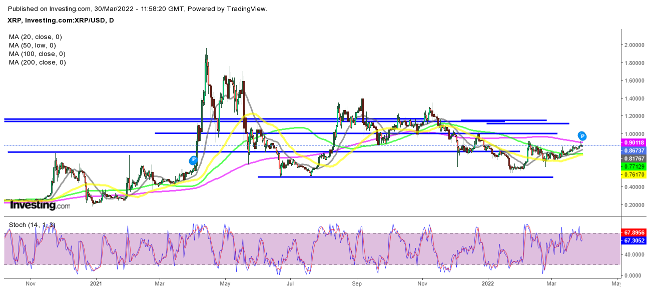 Ripple kaufte letzten Monat 15 Milliarden Dollar seiner Serie-C-Finanzierung zurück, was darauf hindeutet, dass sie zuversichtlich sind, dass die Klage mit einem positiven Ergebnis enden wird, daher die Aufwärtsdynamik bei XRP/USD. Aber die Zone über 0,90 $ stoppte den Sprung letzten Monat und jetzt fällt es XRP schwer, über dieses Niveau zu steigen, während der 200 SMA (lila) jetzt auch als Widerstand fungiert, also werden wir sehen, ob XRP den Schwung halten und pushen kann über $1.