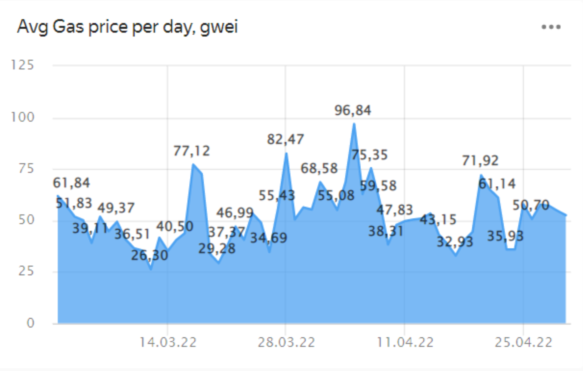 Der Durchschnitt Ethereum Der Gaspreis lag im März bei 47,77 GWEI und im April bei 54,67 GWEI eine Steigerung von 14,4 % im Laufe des Monats.