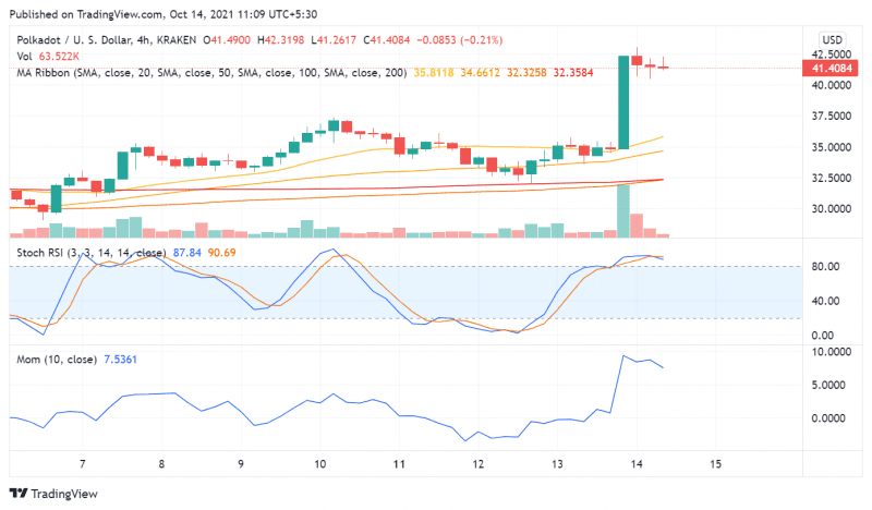 Wenn wir uns das 4-Stunden-Chart von DOT/USD ansehen, finden wir eine starke zinsbullische Tendenz zwischen den gleitenden Durchschnitten und dem MACD. Aber auch andere technische Frühindikatoren, Momentum und Stochastics RSI, zeigen auf, dass sie verkaufen.