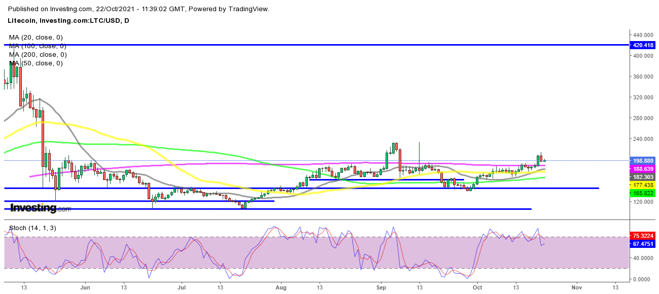 Auf dem H4-Chart sehen wir, dass sich die gleitenden Durchschnitte in Unterstützung für Litecoin verwandelt haben und der Sprung nach oben am Mittwoch in diesem Zeitrahmen vom 20 SMA (grau) aus erfolgte. Gestern ging der Kurs nach unten, aber heute scheint der 20 SMA wieder als Unterstützung zu fungieren. Der Rückzug ist hier ins Stocken geraten und der stochastische Indikator unten ist fast überverkauft. Dies scheint also eine gute Gelegenheit zu sein, bei LTC/USD beim 20 SMA zu long zu gehen, in der Hoffnung, dass der Preis bald nach oben springt und den Aufwärtstrend wieder aufnimmt.