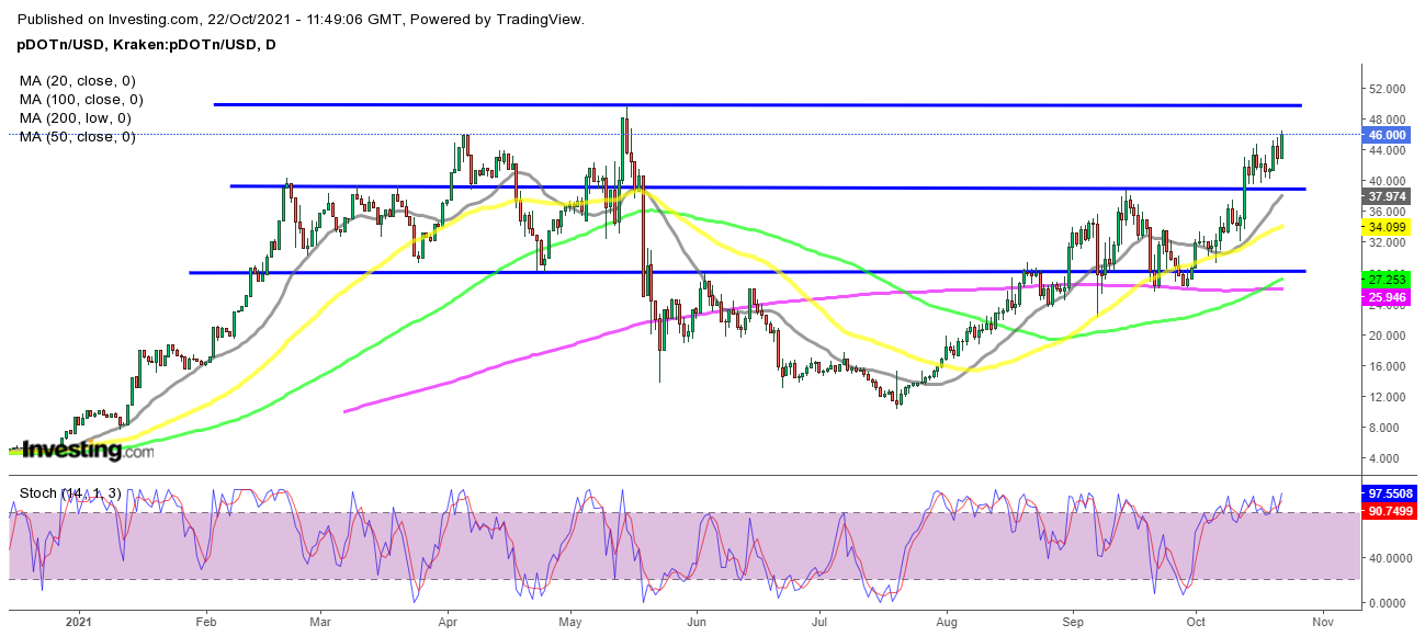 Darüber hinaus hat sich die Stimmung am Markt verbessert, sodass DOT/USD mehr Spielraum hat, um nach oben zu laufen. Das Allzeithoch (ATH) knapp unter 50 US-Dollar ist jetzt das nächste Ziel und Polkadot ist auf dem Weg in diese Richtung, daher denke ich, dass es angesichts des Tempos des Aufwärtstrends nicht allzu lange dauern wird.