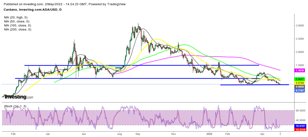 ADA-Token ist seit September rückläufig, nachdem es ein Rekordhoch über 3 $ gedruckt hatte. Seitdem hat diese Kryptowährung ein starkes rückläufiges Momentum gezeigt und niedrigere Tiefs und niedrigere Hochs gedruckt. Im März sahen wir einen anständigen Versuch, zinsbullisch zu werden, als der Preis von 0,75 $ auf 1,25 $ stieg. Aber im letzten Monat wurden die Kryptowährungen wieder rückläufig und ADA/USD fiel wieder unter 1 $.