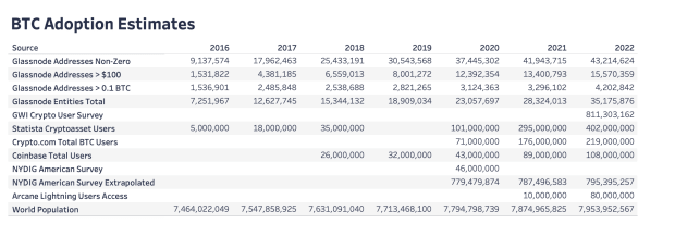 Die folgende Tabelle fasst einige der wichtigsten Bitcoin-Nutzerschätzungen zusammen, die in den letzten sechs Jahren veröffentlicht wurden, um Ihnen eine Vorstellung davon zu geben, wie unterschiedlich diese Schätzungen sein können. Betrachtet man gelegentlich interessierte Benutzer, reichen die Zahlen von 2022 von 200 bis 800 Millionen Benutzern. Dies sind Zählungen aus Umfragestichproben, Daten aus On-Chain-Analysen und beinhalten Börsenbenutzer. Alle diese Studien haben unterschiedliche Definitionen und Methoden zur Berechnung der Akzeptanz, was zeigt, wie schwierig es heute ist, Schätzungen zu vergleichen.
