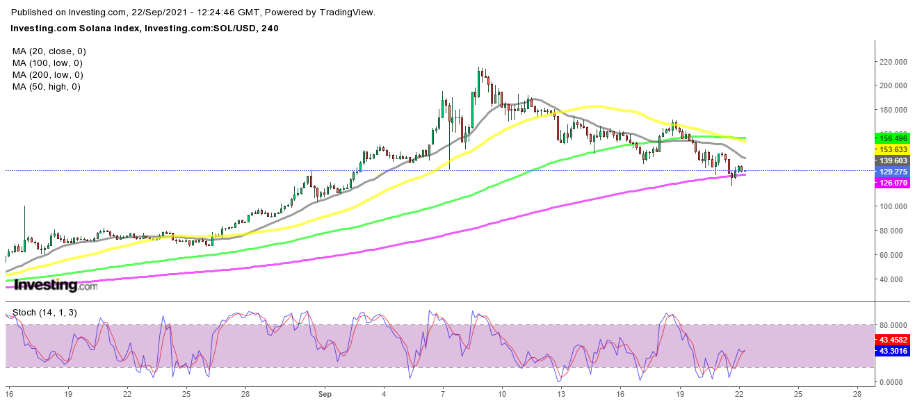 Solana war bis wenige Tage nach dem Flash-Crash auf dem Markt vor zwei Wochen eine weitere ziemlich bullische Krypto. Aber es kehrte sich um, nachdem sich oben eine große Doji-Kerze gebildet hatte, die bei etwa 216 US-Dollar lag. Fast genau wie im Fantom H4-Chart haben die gleitenden Durchschnitte einen guten Job gemacht, um Solana zu unterstützen.