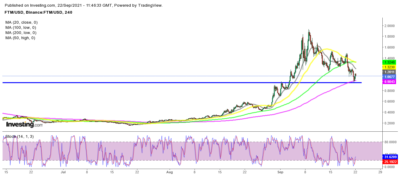 Obwohl schließlich der Rückgang des Marktes begann, zu ziehen FTM/USD auch nach unten, fand aber für einige Zeit Unterstützung beim 20-Tages-SMA. Dieser gleitende Durchschnitt wurde ebenfalls durchbrochen, als die zweite rückläufige Etappe kam, aber heute sehen wir, dass der Preis vom vorherigen Hoch bei 0,95 $ abprallt, das sich jetzt möglicherweise in eine Unterstützung verwandelt hat. Der stochastische Indikator ist überverkauft, daher könnte dies wirklich der Beginn der zinsbullischen Umkehr sein.