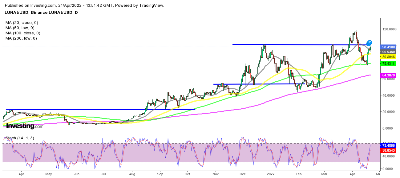 Terra LUNA ist seit Anfang letzten Jahres größtenteils bullisch geblieben, mit gelegentlichen Pullbacks nach unten, was den Trend nicht wirklich bedroht hat, wie im Großteil des Kryptomarktes. Im Dezember sahen wir einen tiefen Pullback, der LUNA/USD aufgrund der Wonderland-Kontroverse auf 44 $ schickte, und Anfang dieses Monats sahen wir einen weiteren Pullback, aber er scheint jetzt vorbei zu sein, da sich der Preis in den letzten Tagen nach oben bewegt hat. LUNA ist von etwa 76 $ gestiegen und bewegt sich jetzt auf 100 $ zu.