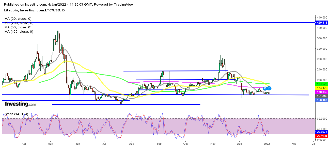 Käufer haben versucht, den Preis umzukehren, aber die Versuche waren wirklich schwach und LTC bleibt nahe der Unterstützungszone. Auch das Volumen von Litecoin ist Ende 2021 auf 1,1 Milliarden US-Dollar gestiegen. Auch die Zahl der Händler, die LTC-Zahlungen akzeptieren, nimmt weiter zu, insbesondere mit der Einführung der LTC Visa-Debitkarte. Aber LTC bleibt in der Nähe von 140 US-Dollar leblos. Ich gehe davon aus, dass Litecoin erst dann bullisch wird, wenn der Kryptomarkt den Aufwärtstrend wieder aufnimmt, also verfolgen wir die Preisbewegungen auf dem Markt.
