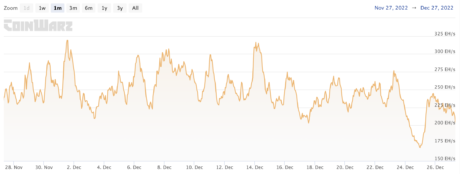 Bis zum Weihnachtstag war die globale Hashrate um fast 40 % gesunken und von ihrem Höchststand am 24. Dezember von 276 Exahashes pro Sekunde (EH/s) auf 175 EH/s gefallen. Am selben Tag gab es jedoch einen Anstieg der Hashrate um 39 %, was sie wieder auf etwa 244 EH/s brachte.