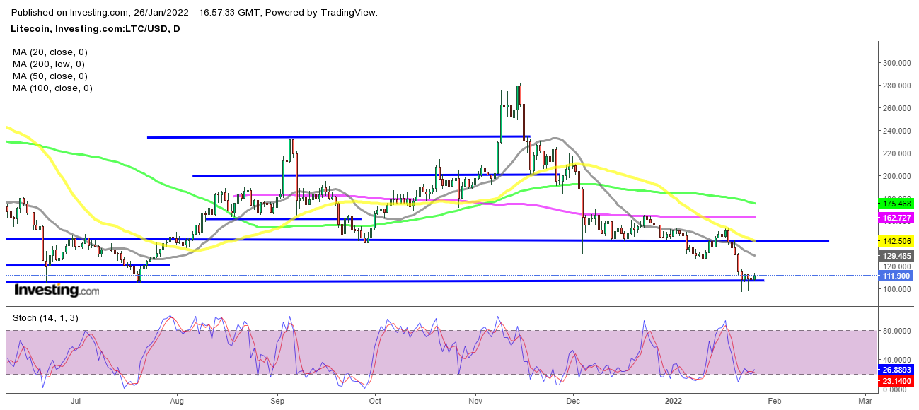 Litecoin war eine der bärischen Kryptowährungen unter den großen, zusammen mit Ripple (XRP) und Cardano (ADA). Nachdem es Anfang November nicht gelungen war, die Gewinne nahe der 300-Dollar-Marke zu halten, LTC/USD wurde rückläufig und ist seitdem rückläufig. Die Unterstützung bei rund 140 $, die einen Monat lang gehalten wurde, wurde diesen Monat durchbrochen, und jetzt handelt der Preis in der ultimativen Unterstützungszone, die sich zwischen 100 $ und 105 $ erstreckt.