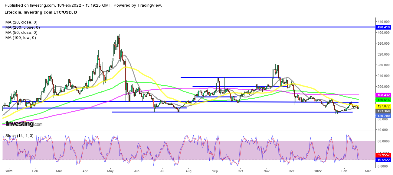 Seitdem zeigte die Preisaktion eine gewisse positive Dynamik und LTC/USD stieg auf 144 $, wo es Widerstand in der vorherigen Unterstützungszone fand, die sich von 140 $ bis 145 $ erstreckt. Jetzt hat sich der Preis wieder nach unten umgekehrt und wir warten ab, ob LTC/USD die Unterstützungszone über 100 $ erreichen wird, wo wir etwas mehr LTC kaufen würden, nachdem wir zuvor bei 123 $ gekauft hatten.