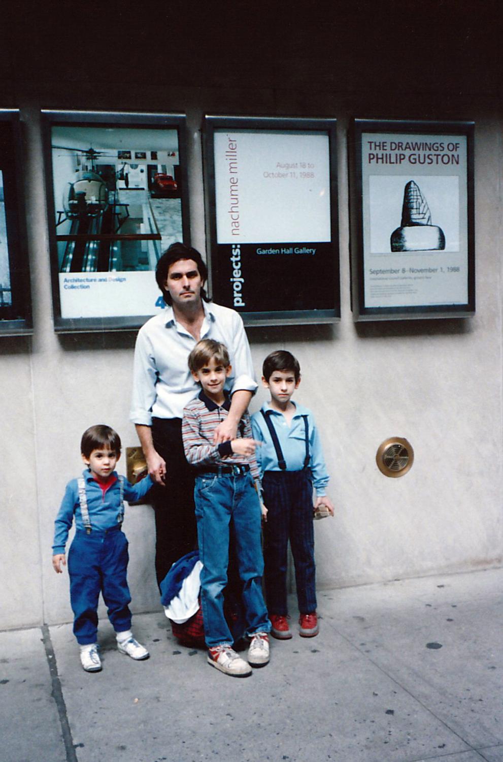 Ein Familienfoto zeigt den Künstler Nachume Miller mit seinen drei Söhnen, von links: Adam, Matthew und Danny, vor dem Museum of Modern Art in Manhattan am Vorabend seiner Eröffnung dort im Jahr 1988. DANNY MILLER /The New York Times